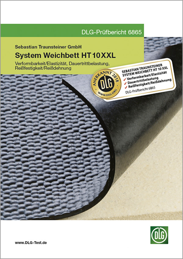 Das hier geprüfte Traunsteiner Weichbett HT 10 XXL, ein elastischer Bodenbelag im Liegebereich für Hochboxen in Liegeboxenställen, wurde im DLG-ANERKANNT-Einzelkriterien-Test auf Prüfständen auf Haltbarkeits- und Komforteigenschaften untersucht. Im Einzelnen wurden die Beständigkeit gegen Dauertrittbelastung und die Verformbarkeit und Elastizität geprüft und die Reißfestigkeit und Reißdehnung gemessen.