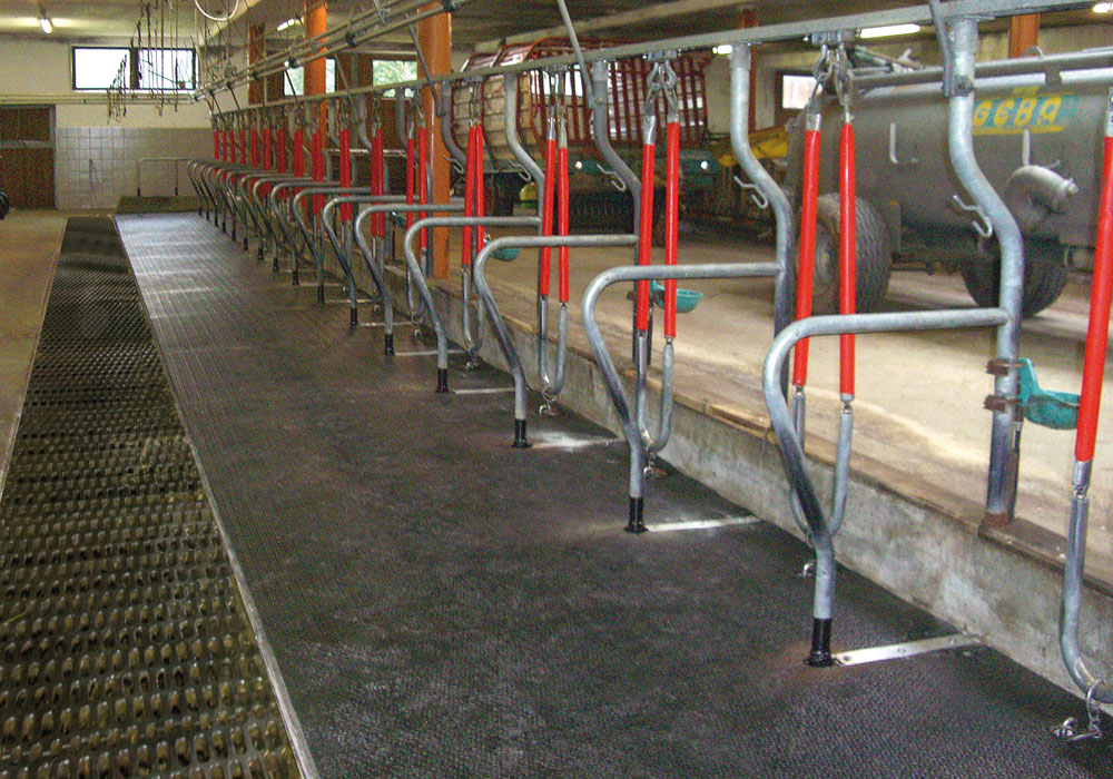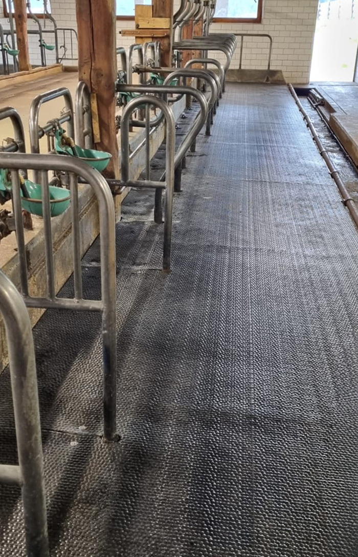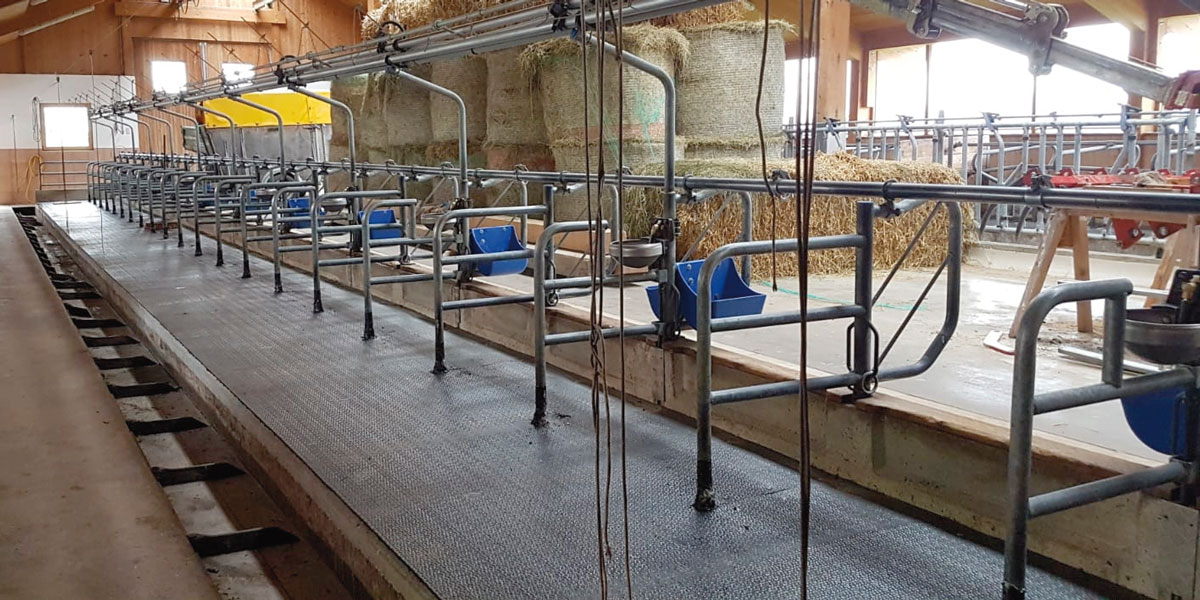 Der robuste Anbindebelag N33/A erfreut sich in Tirol großer Beliebtheit und wird seit 2011 eingebaut. Die Beläge gibt es mit 180 und 190 cm Standlänge und werden auf einer Rolle nach Maß (max. 40 Meter) geliefert und von uns eingebaut. Da die Anbindestände zwei Füße haben, wird der Trennbügel fachgerecht von unseren Monteur ausgeschnitten (siehe Bilder).
